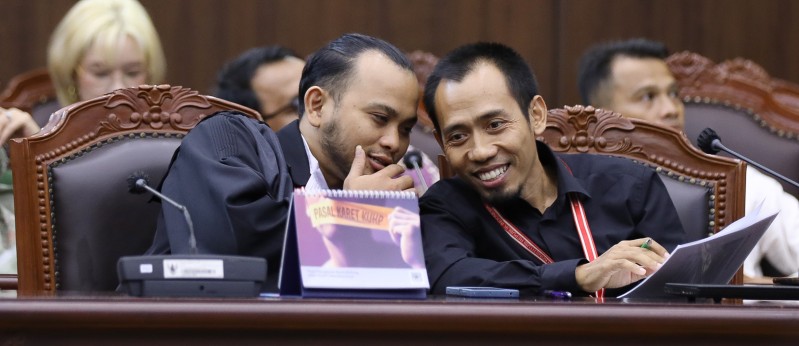 Ekspresi Pemohon Prinsipal bersama Kuasa Hukumnya saat mendengarkan Sidang Pengucapan putusan uji Undang-Undang Nomor 20 Tahun 2003 tentang Sistem Pendidikan Nasional, Selasa (27/05) di Ruang Sidang MK. Foto Humas/Ifa.
