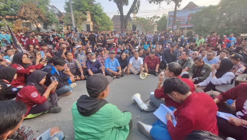 Unik. Unjuk rasa mahasiswa Solo dilakukan dengan duduk bareng. Suasana aksi unjuk rasa ratusan mahasiswa dari berbagai kampus di Soloraya, Senin (01/09/2025) sore, berlangsung aman, nyaman dan kondusif.