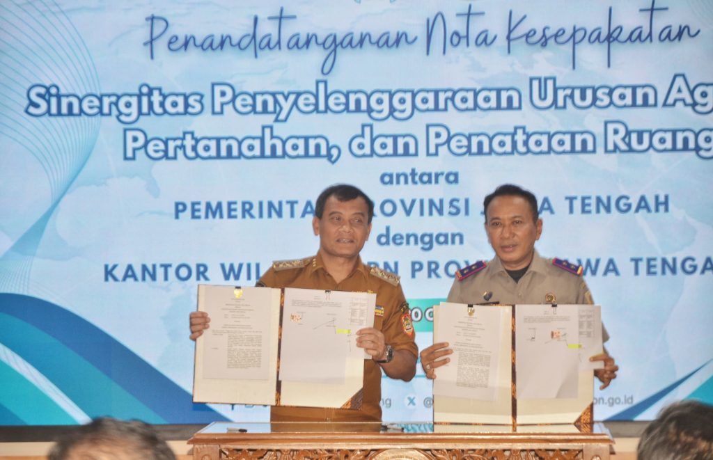SEMARANG, SUARASOLO.id – Pemerintah Provinsi (Pemprov) Jawa Tengah dan Kantor Wilayah Badan Pertanahan Nasional (BPN) setempat, menandatangani nota kesepakatan soal sinergi penyelenggaraan urusan pertanahan, agraria, dan penataan ruang.