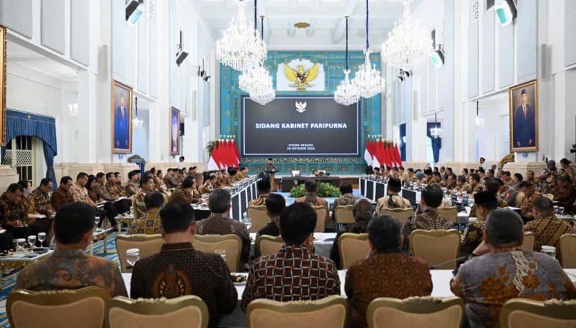 Presiden Prabowo Subianto bersama Wakil Presiden Gibran Rakabuming memimpin Sidang Kabinet Paripurna dalam rangka memperingati satu tahun pemerintahan Kabinet Merah Putih di Istana Negara, Jakarta, pada Senin, 20 Oktober 2025. Sidang kabinet yang dihadiri seluruh menteri dan pejabat tinggi negara ini menjadi momentum refleksi kinerja pemerintahan selama setahun pertama sejak pelantikan Presiden Prabowo pada 20 Oktober 2024.
