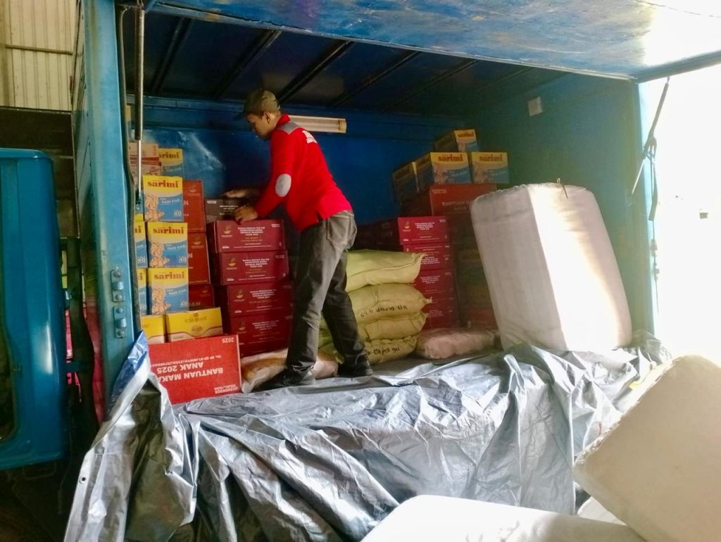 Selain itu, disalurkan pula bantuan logistik berupa gula pasir, minyak goreng, mi instan, dan sarden kaleng.