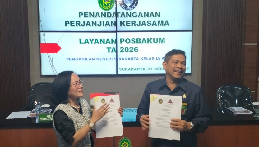 SOLO, SUARASOLO.id – Ketua PN Solo, Dr Achmad Satibi SH MH bersama Ketua LBH Solo Justice & Peace, Asri Purwanti SH, MH, CIL, CPM menandatangani kerjasama, setelah LBH tersebut menempati Pos Bantuan Hukum (Posbakum) di PN Solo, mulai Rabu (31/12).