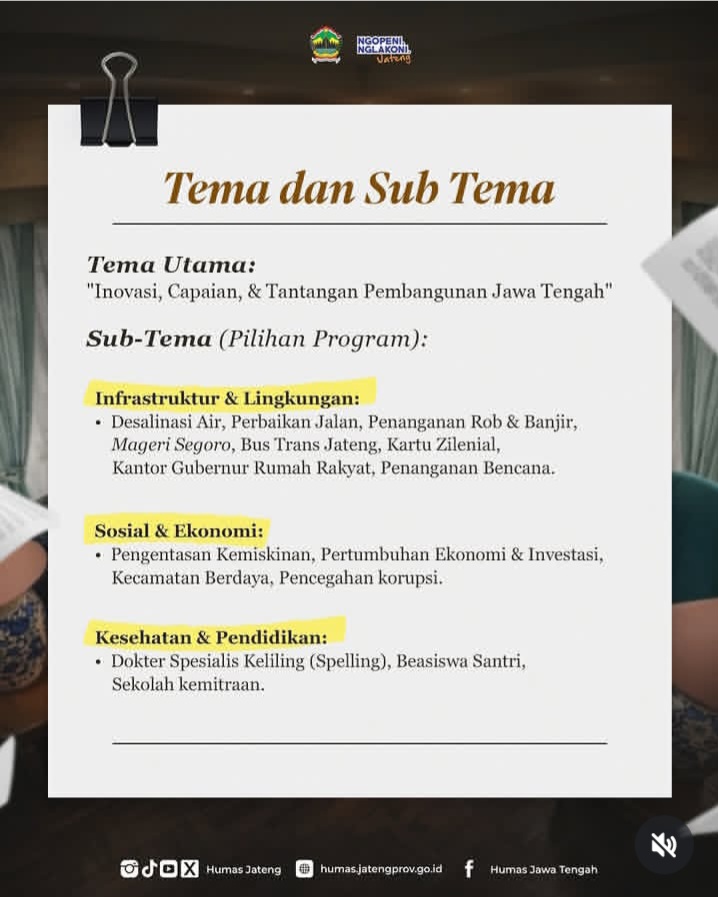 Para peserta dapat menuliskan beberapa subtema, meliputi Infrastruktur & Lingkungan (Desalinasi Air, Perbaikan Jalan, Penanganan Rob & Banjir, Mageri Segoro, Bus Trans Jateng, Kartu Zilenial, Kantor Gubernur Rumah Rakyat, Penanganan Bencana); Sosial & Ekonomi (Pengentasan Kemiskinan, Pertumbuhan Ekonomi & Investasi, Kecamatan Berdaya, Pencegahan korupsi); serta Kesehatan & Pendidikan (Dokter Spesialis Keliling (Speling), Beasiswa Santri).
