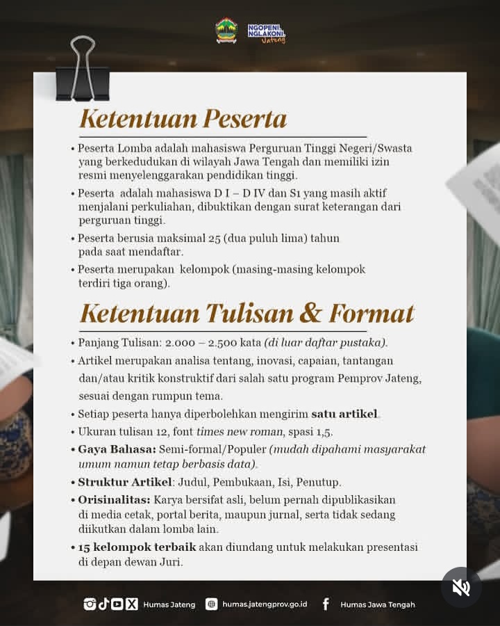 Lomba penulisan dengan tema “Inovasi, Capaian, dan Tantangan Pembangunan Jawa Tengah” ini diperuntukkan bagi mahasiswa perguruan tinggi se-Jawa Tengah.