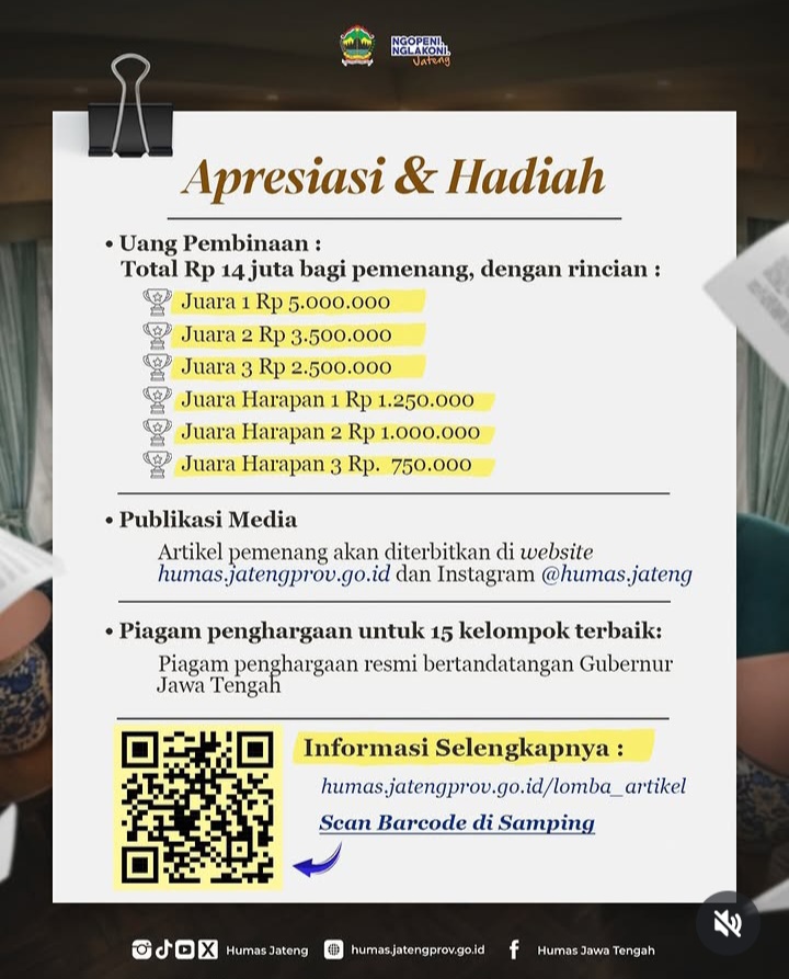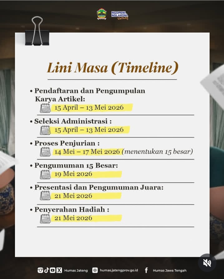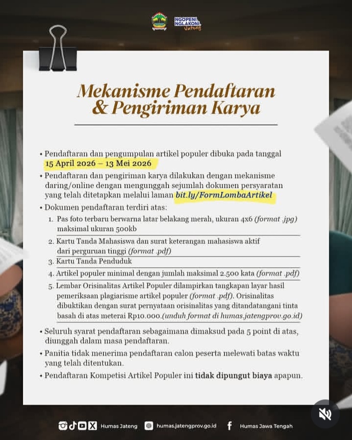 Adapun terkait persyaratan dan informasi lebih lengkap, para peserta bisa mengakses melalui website resmi Humas Pemprov Jateng https://humas.jatengprov.go.id/lomba_artikel dan Instagram @humas.jateng.