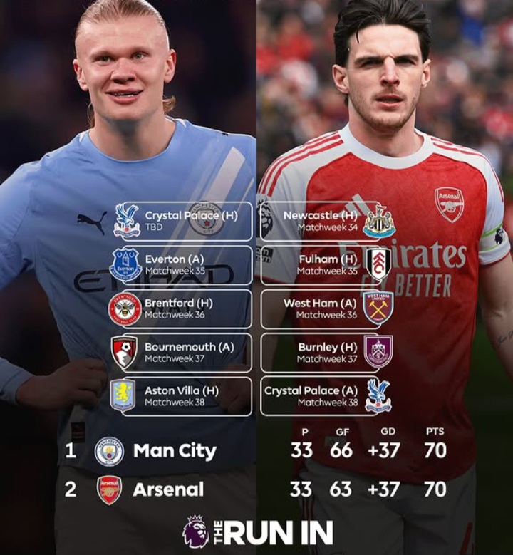 Sementara Liga Inggris menyisakan 5 Pertandingan lagi yang bakal berlangsung seru. Seandainya Man City berhasil memenangi 5 laga tersisa, dipastikan Gelar Liga Inggris akan diraih Manchester City. Dan Arsenal akan tetap menjadi peringkat 2, seperti musim kemarin.