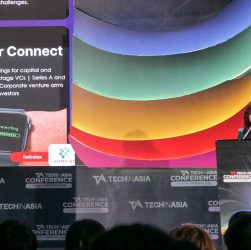 Menteri Komunikasi dan Digital Meutya Hafid dalam pidato kuncinya pada acara Tech in Asia Conference 2025 di Jakarta, Selasa (22/10/2025) …